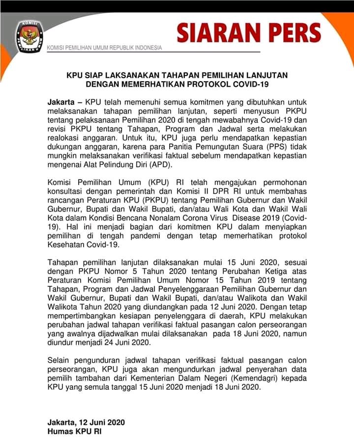 KPU Siap Laksanakan Tahapan Pemilihan Lanjutan dengan Memerhatikan Protokol Covid-19 14 Juni 2020 Ditulis oleh Admin Keceh Bagikan ini: Bagikan ke X(Membuka di jendela yang baru) X Bagikan pada Facebook(Membuka di jendela yang baru) Facebook Suka Memuat... Terkait